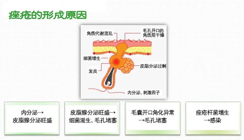 由于痤疮是一种多因素引起的疾病,除以上因素外,油性肌肤油脂分泌多、毛囊皮脂腺导管角化异常、毛囊口内痤疮丙酸杆菌等微生物作用,也易引发痤疮。再者,免疫因素、遗传因素,日常生活中饮食不健康、睡眠不充足、皮肤清洁不科学、压力过大等也能导致痤疮发生。