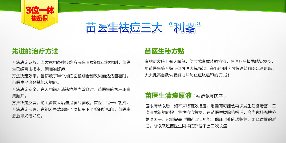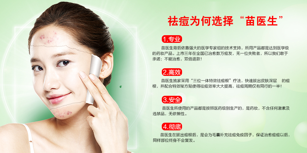 苗医生独家采用"三位一体特效祛痘根"法,快速拔除皮肤深层的痘根,并配合特效秘方贴使得祛痘效率大大提高,祛痘周期仅有同行的一半!